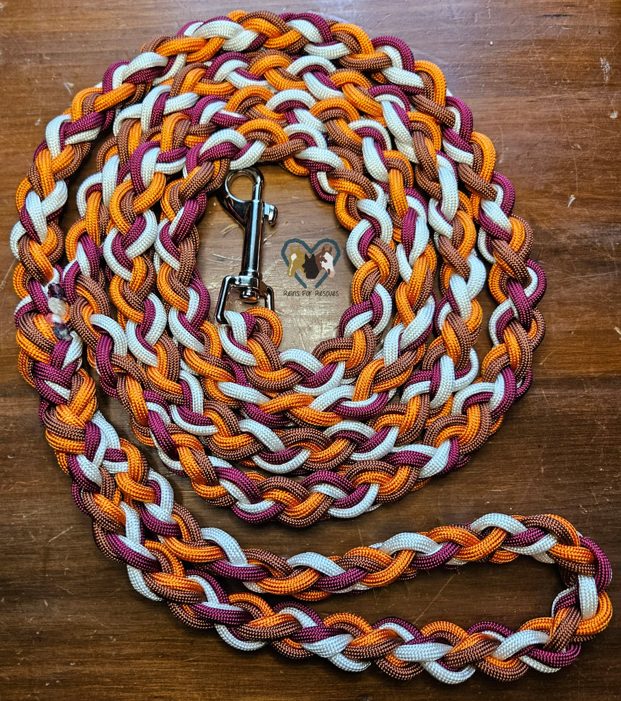 This finely crafted dog leash brings a touch of sophistication to your everyday walk with its elegant color combination of classic burgundy, brown, orange, and white. Handmade in the USA with durable paracord, it measures approximately 6 feet long and is designed to withstand daily use.