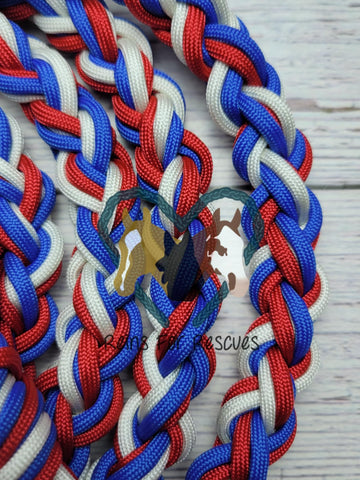 This vibrant lead rope, measuring around 7 feet, combines striking red, white, and blue colors to make a bold statement. Hand-braided from 100% USA-made paracord, it offers exceptional strength and durability. Easily washable, this rope is built to withstand tough use while maintaining its vivid appearance, ensuring your horse stands out confidently wherever you go.