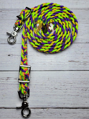 These vibrant riding reins, measuring approximately 3/4" wide and 7.5 feet long, combine daring colors of yellow, purple, and lime green for a bold look. Crafted for strength and easy washing, they deliver durability without sacrificing style. Perfect for riders who want to stand out while maintaining reliable control.
