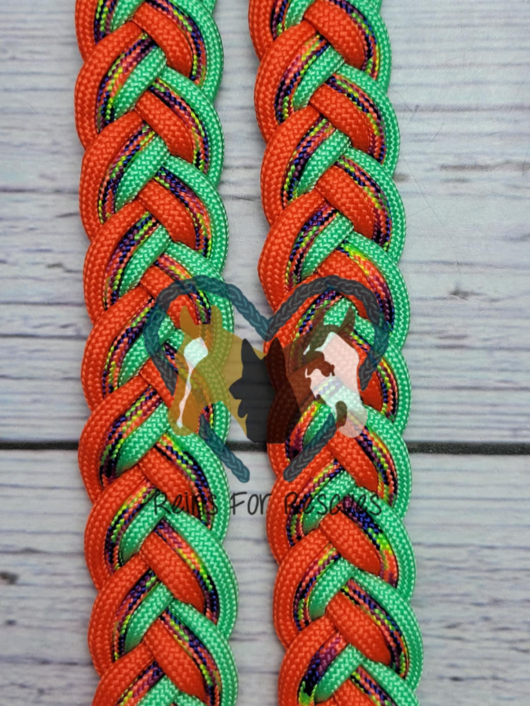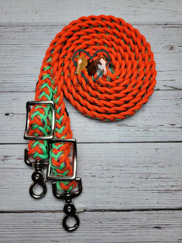 These Mint, Hippie & Orange Adjustable Riding Reins bring a playful pop of color to every ride. Measuring about 7.5 feet long, they're hand-braided for strength and durability while staying washable for easy cleaning after your adventures. Designed for riders who dare to stand out, these reins combine vibrant style with reliable performance every time you hit the saddle.