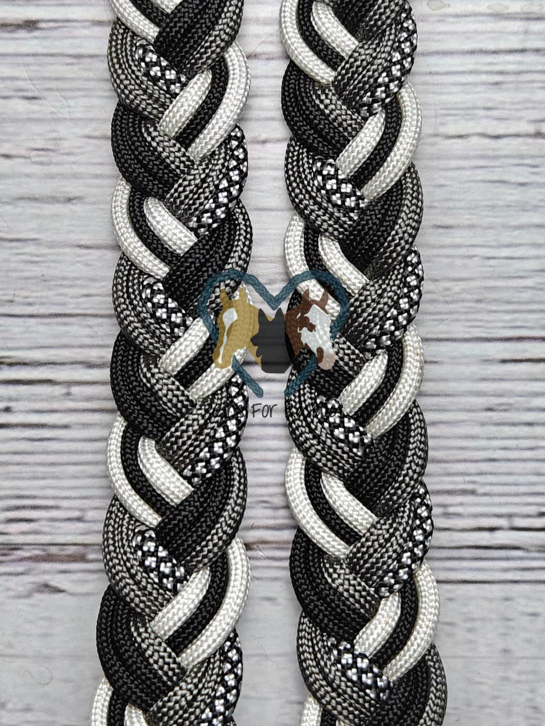 Elevate your riding experience with these refined adjustable reins, featuring a striking interplay of silver diamonds, black, white, and charcoal tones. Measuring approximately 7.5 feet in length, they offer versatile positioning for various riding disciplines and preferences. Crafted for durability, these reins withstand rigorous use and frequent washing, maintaining their sophisticated aesthetic through countless rides. The thoughtfully coordinated color palette complements both traditional and contemporary tack setups, making them an elegant addition to any equestrian's collection.