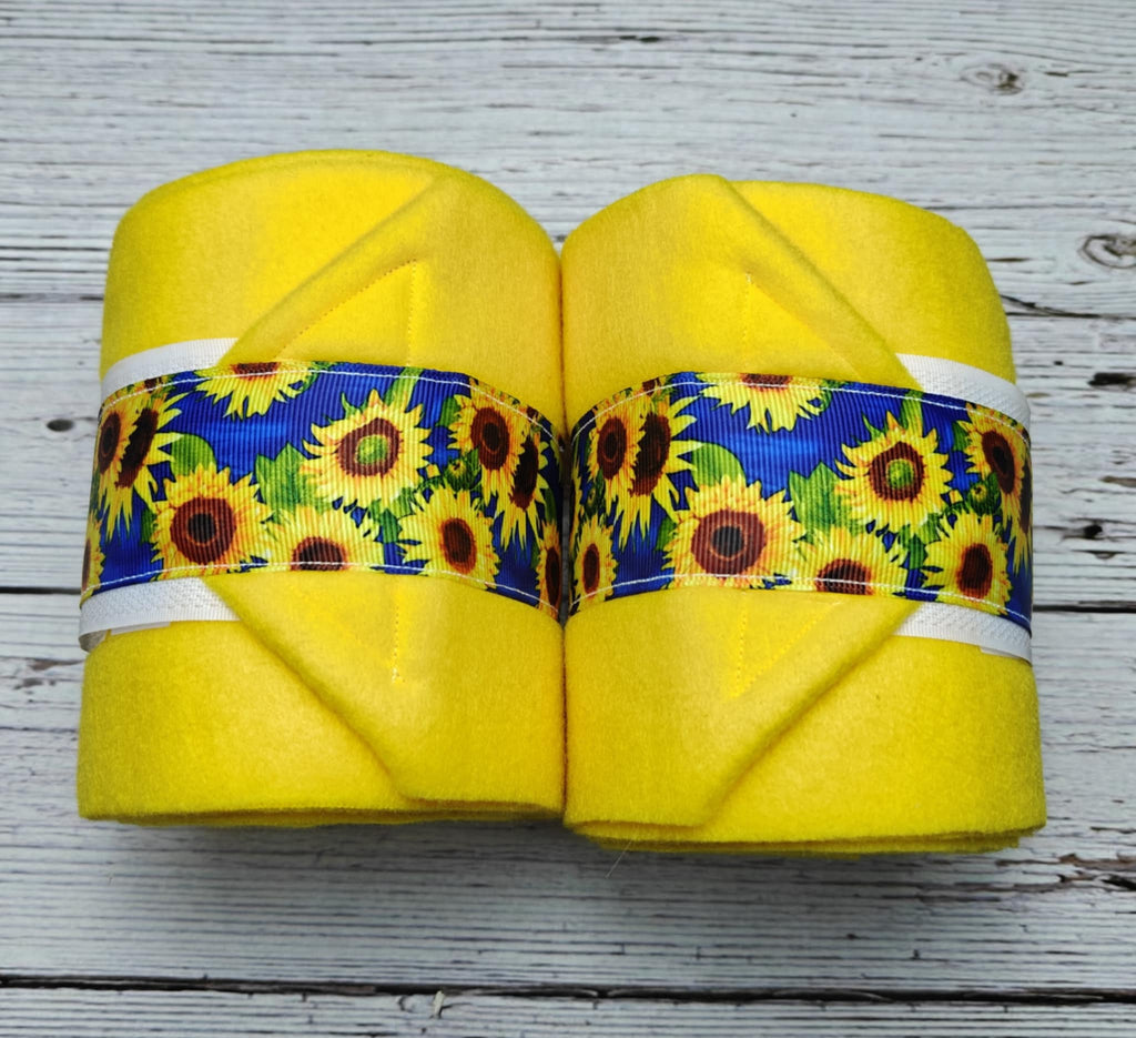 Set of 2 Polos - Unleash bold style with these expertly hand-crafted neon yellow polos, featuring eye-catching sunflower trim that demands attention. Engineered by PoloZ R Us for superior equine leg support, these daring wraps deliver both protection and personality. Secure Velcro closures ensure a custom fit for any horse, while machine-washable fabric keeps them looking vibrant through countless rides. Make a statement in the arena—because your horse deserves gear as fearless as their spirit.