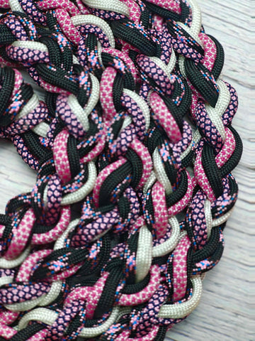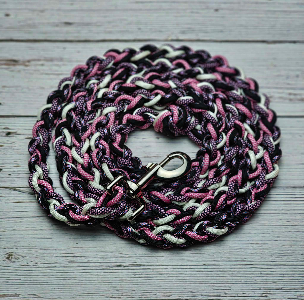 Meet your horse's new favorite accessory—a hand-braided lead rope that's as tough as it is charming. This 7-foot beauty features an eye-catching pink diamond pattern woven with black and white accents that'll turn heads at the barn. Built with strength to handle spirited pullers, it's designed so your clever equine friend can't easily untie themselves. Machine washable for easy care, this rope combines durability with undeniable style. Perfect for handlers who refuse to compromise on function or flair.