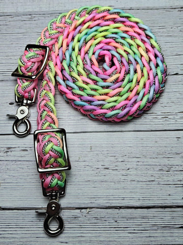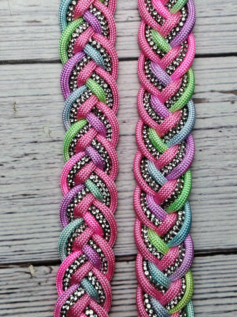 These stunning adjustable reins feature a dazzling rhinestone center that sparkles with every stride! Soft pastel hues—think dreamy pinks, purples, yellows, and greens—create a magical rainbow effect perfect for any princess. Stretching approximately 7.5 feet in length, they're built tough enough for serious riding while delivering serious style. Watch heads turn as your equine partner glimmers in the arena or on the trail. Pure enchantment meets durability!