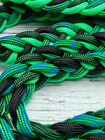 Unleash your boldest riding style with this striking neck rope, engineered for liberty and tackless riding where precision meets freedom. Measuring approximately 54" in overall length, it delivers the control and responsiveness serious riders demand. Crafted from durable, washable materials that withstand intense training sessions and frequent use, this rope maintains its vibrant black base with mint green and turquoise accents—a fearless color combination that commands attention in the arena or on the trail. Whether you're pushing boundaries or perfecting your craft, this neck rope is built to perform as hard as you do.