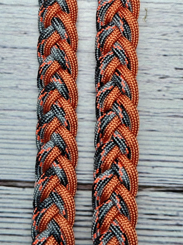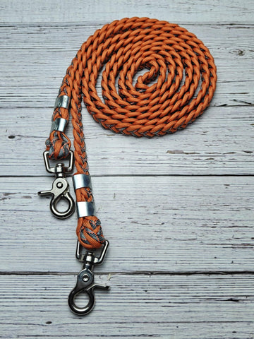 Elevate your riding experience with reins designed for both form and function. These loop reins feature a sleek gray colorway with warm orange undertones that add personality to your tack collection. Engineered for strength and reliability, they span 7.5 feet with a substantial 3/4" width—giving you the control and comfort you need for confident handling. Whether you're schooling, competing, or hitting the trails, these reins combine durability with contemporary style that riders appreciate. Choose quality that matches your commitment to your horse.