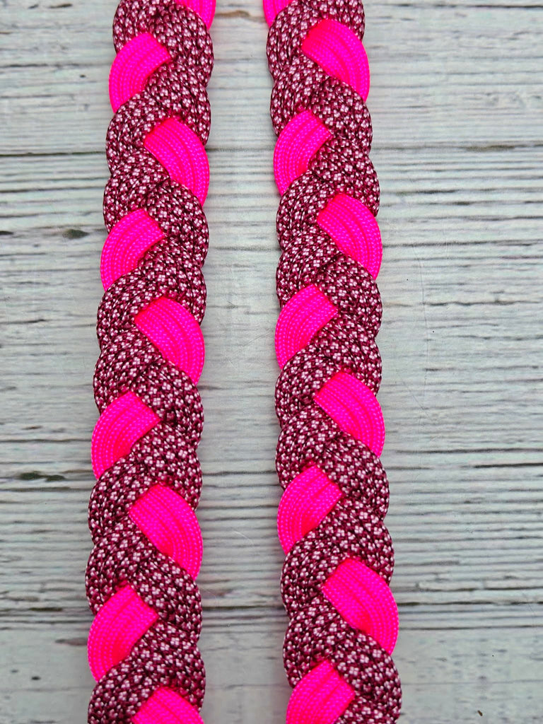 Hand-braided reins in vibrant hot pink with rose pink accents, crafted for riders who love bold color. Measuring approximately 7.5 feet in overall length, these adjustable reins offer the perfect fit for various riding styles. Built to last with durable, washable 100% USA made paracord, they withstand regular use and frequent cleaning. Strong construction ensures reliable performance in the saddle, while the eye-catching design makes a statement at the barn or arena.